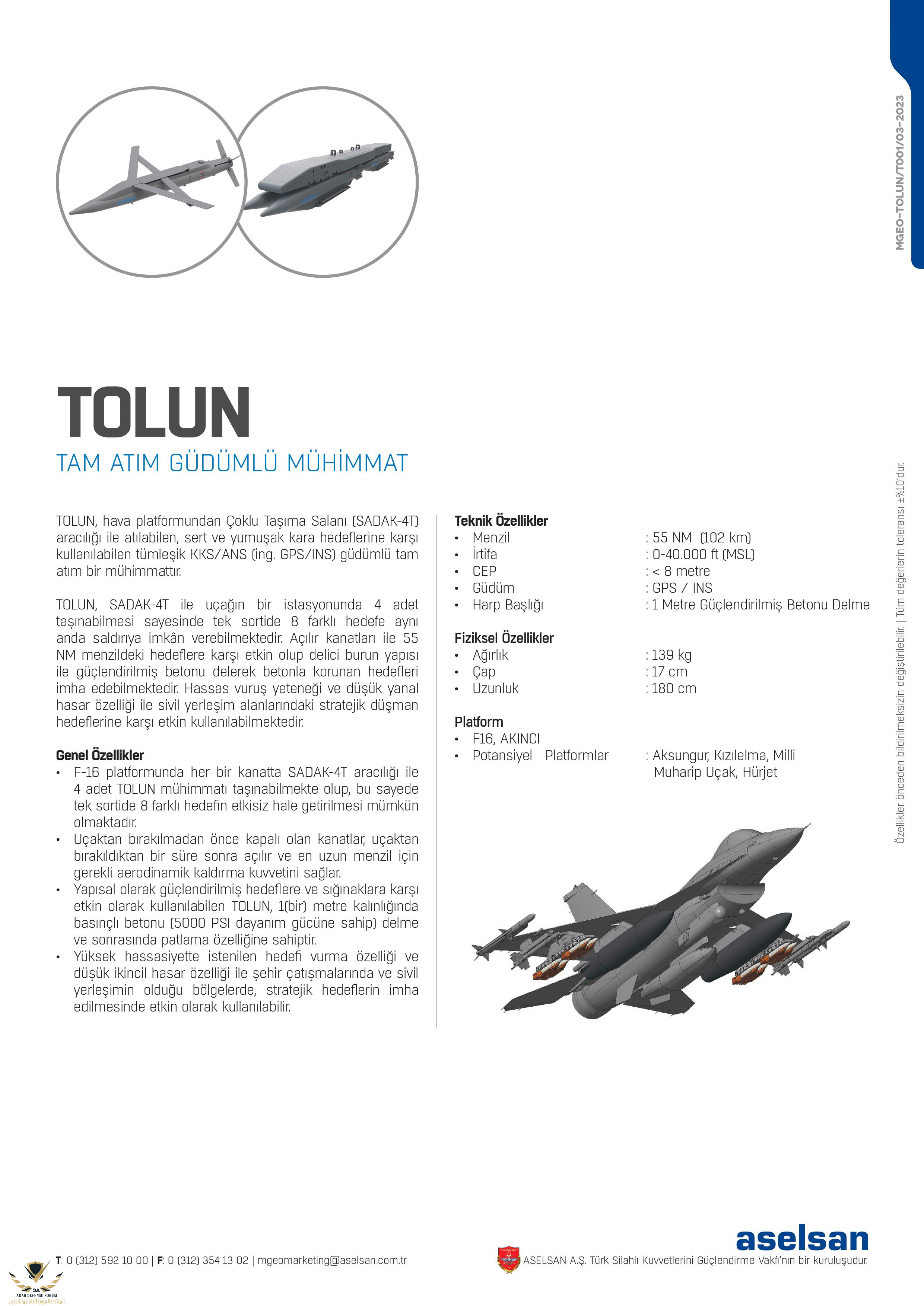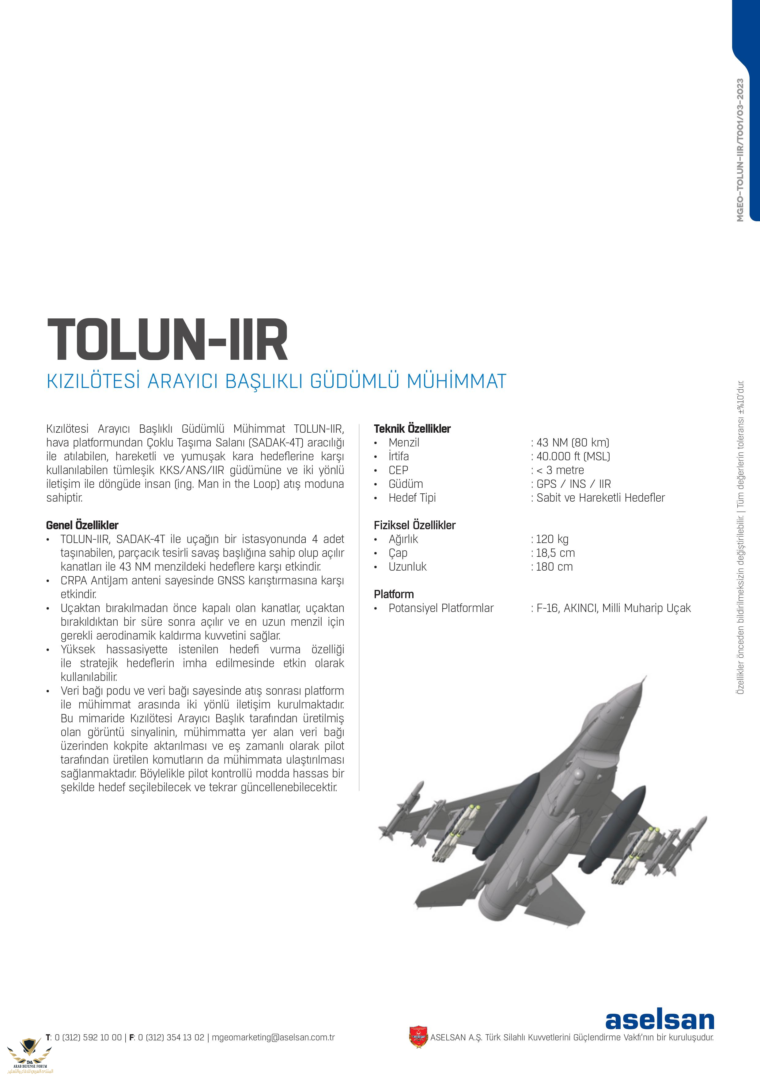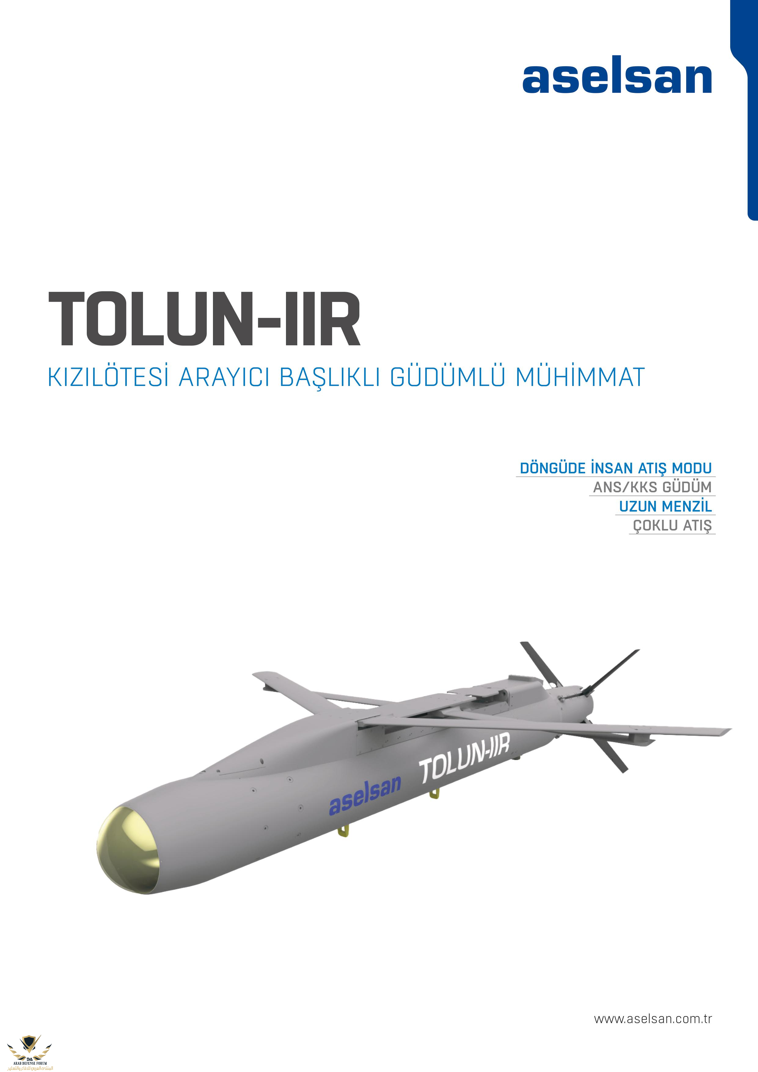 تم الإعلان عن ميزات ذخيرة TOLUN IIR الموجهة التي تعمل بالأشعة تحت الحمراء والتي طورتها ASELSAN. في هذا السياق ، يمكن إطلاق الذخيرة الموجهة للباحث بالأشعة تحت الحمراء TOLUN-IIR من منصة جوية عبر منطقة النقل المتعددة (SADAK-4T). لقد دمجت الذخيرة المعنية توجيهات KKS / ANS / IIR ، والتي يمكن استخدامها...