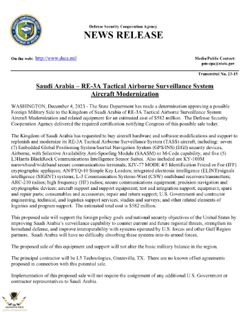 وافقت الخارجية الأمريكية على مبيعات عسكرية محتملة للمملكة العربية السعودية لتحديث طائرات RE-3A بتكلفة تقديرية تبلغ 582 مليون دولار