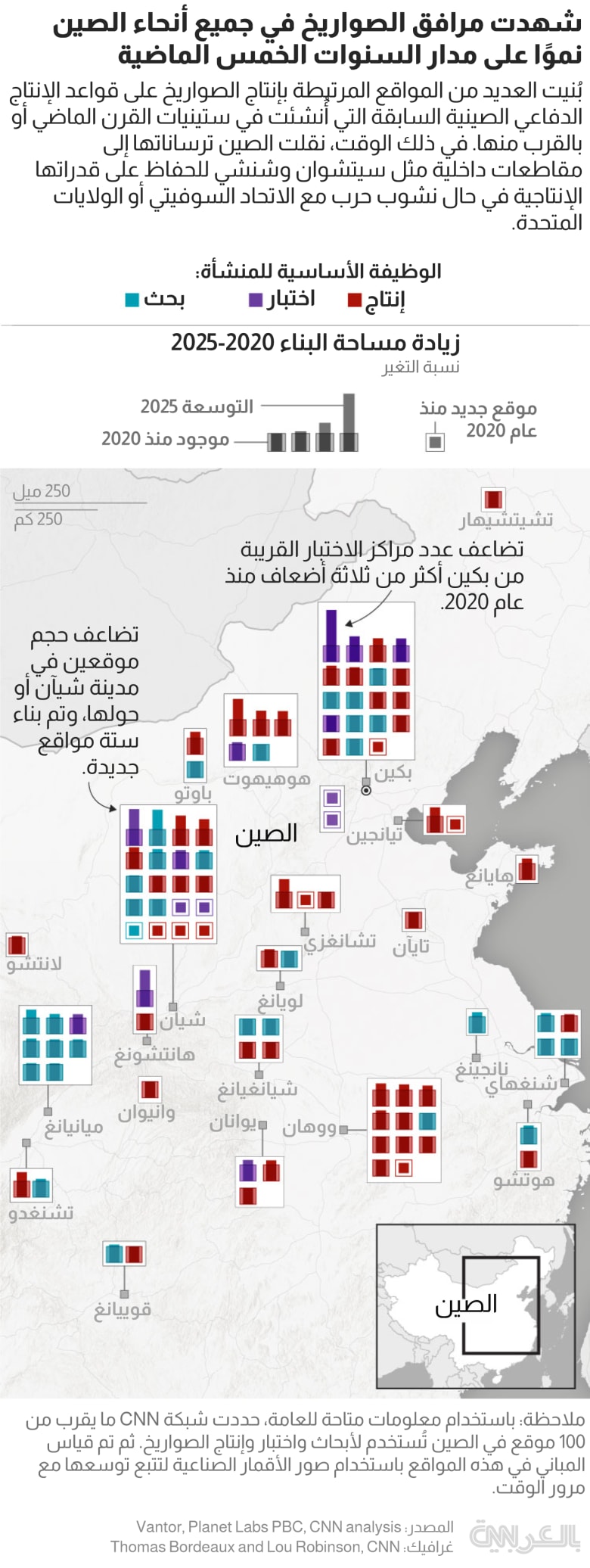 (CNN)-- كشفت دراسة جديدة أجرتها شبكة CNN لصور الأقمار الصناعية والخرائط والإشعارات الحكومية أن الصين توسعت بشكل هائل في المواقع المرتبطة بإنتاج الصواريخ منذ عام 2020، مما عزز قدرتها على ردع الجيش الأمريكي وتأكيد هيمنتها في المنطقة.
